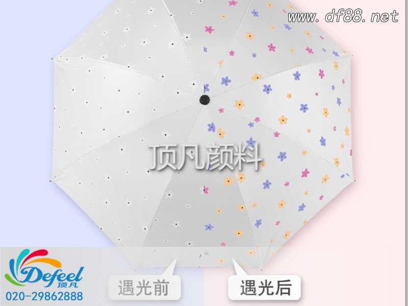 這種加入了光變粉的太陽傘在光的照射下變得與眾不同,在千篇一律的太陽傘中激起了一點(diǎn)小小的趣味浪花,為生活增添色彩。科技改變生活,同時(shí)也把我們領(lǐng)進(jìn)一個(gè)全新的社會(huì),變色顏料在各行業(yè)中的應(yīng)用也在不斷改變我們的生活。感光變色粉又稱光變粉、光變顏料、光變色粉等,是使用微膠囊技術(shù)加工制備的光變材料,外觀為粉狀,平均粒徑為3±1 μm,使用簡單,適用性廣,光變粉基本色有十幾種顏色,如葡萄紫、湖藍(lán)色、檸檬黃、樹莓紅等,環(huán)境耐受性和抗光老化性能高。加入光變粉的太陽傘在經(jīng)過陽光/紫外線照射后、產(chǎn)生顏色變化;當(dāng)失去陽光/紫外線后會(huì)還原回原本的顏色,從而實(shí)現(xiàn)顏色轉(zhuǎn)變。變色太陽傘就充分運(yùn)用了光變粉的變色原理,在遇光之后實(shí)現(xiàn)從“無色--有色”狀態(tài)的顏色變化。